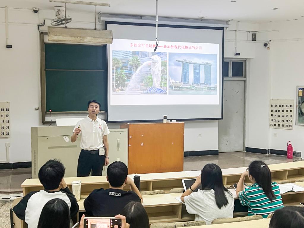 李建军首先解读了新加坡的标志性建筑——鱼尾狮的象征意义,强调其代表新加坡现代化模式的灵活性,是中西方治国理念的巧妙融合。他回顾新加坡从20世纪60年代第三世界国家到现代发达国家的崛起历程,阐释新加坡的快速发展得益于其独特的现代化发展模式,勉励在座师生们以开放的心态,放眼世界,积极探索中国传统与现代、东方与西方的融合之道,为中国的发展贡献智慧与力量。