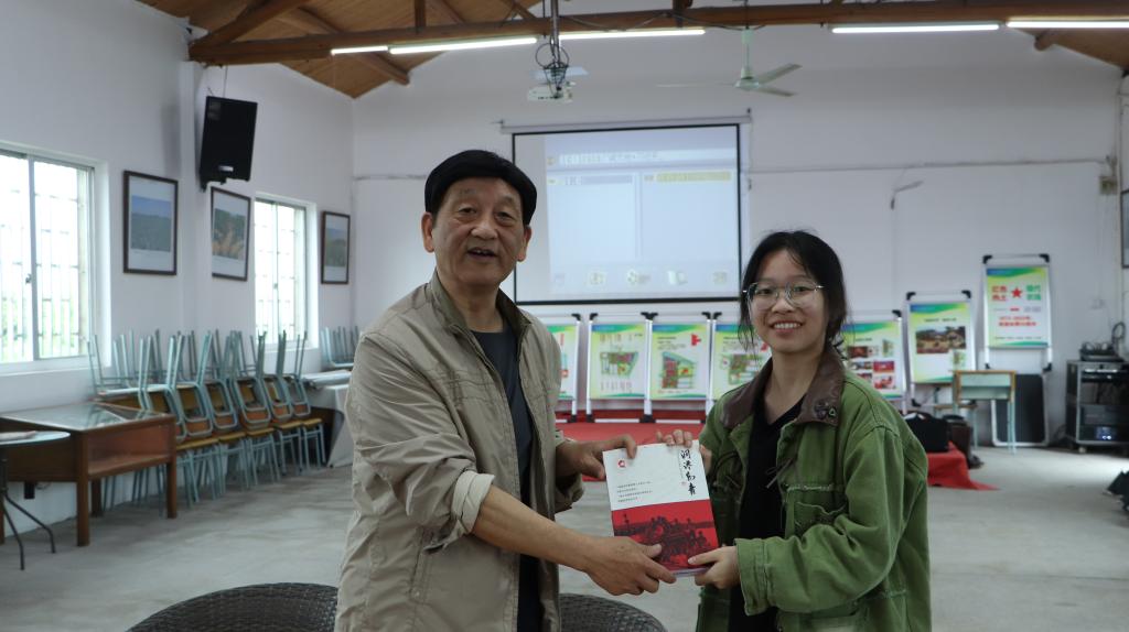 活动现场,临海市洞港青年农场文博馆馆长王鸣以专业且生动的讲述,带领大家深入探寻洞港青年农场的历史底蕴与文化内涵。王鸣面向到访人员开展了一场别开生面的垦荒精神主题宣讲。他回忆往昔岁月,谈到在洞港青年农场创建初期,面对极端艰苦的自然环境与匮乏的物资条件,知青们以苦为乐,凭借着顽强的意志与坚定的信念,用双手开垦荒田、搭建屋舍,在这片土地上挥洒青春汗水,最终成功建立起洞港青年农场,谱写了一曲艰苦创业的奋斗赞歌。宣讲结束后,王鸣向在场人员赠书,鼓励大家传承好垦荒精神和知青精神。