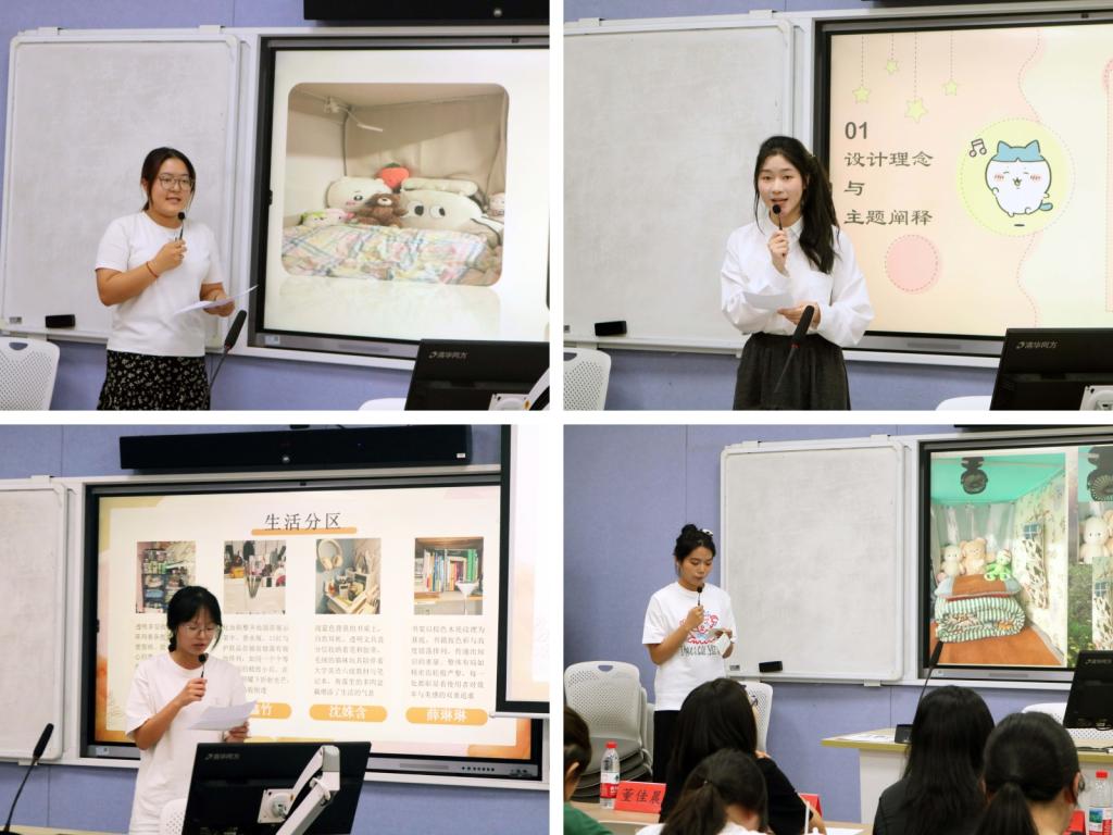决赛现场,寝室组参赛者利用多媒体展示与现场解说相结合的方式,生动呈现了风格各异的寝室设计方案。有的寝室通过花卉拼贴增添自然氛围;有的寝室利用书法作品丰富文艺气息;也有寝室打造“回忆墙”定格同窗情谊。通过成员介绍、设计理念、装饰特色、未来展望等分享模块,选手们不仅展现了丰富多彩的生活日常与和谐融洽的寝室氛围,更彰显了人文学子积极向上的精神风貌。在个人组比赛环节,选手们依据生活习惯与个人爱好,分享了书桌个性化布置、空间巧妙收纳、特色生活角等创意方案,充分体现了个人对学习生活空间的独特理解和匠心巧思。