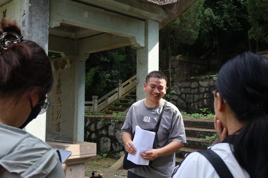 6月30日下午,人文学院浙东古韵实践队开启2025年暑期社会实践。实践队首站来到了临海市大田街道白石村金鸡山,实地考察唐代文化大家郑虔先生的衣冠冢。队员们通过史料讲解、现场寻访与文化诵读,在历史遗存与当代实践的对话中,追溯这位“台州文化启蒙者”的生平脉络。
