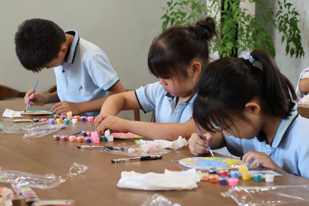 知识课堂结束后,队员们分发素白纸扇,引导孩子们绘制心中的美好图景。有的描摹荷叶亭亭、蜻蜓点水,有的勾勒冰雪世界、星空银河。十岁的李宛馨轻轻摇晃着自己绘制的“碧湖泛舟”扇面,笑着说:“我要学古人‘轻罗小扇扑流萤’!”在矿物颜料的点染下,本土元素跃然扇面——野溪石桥、村头古榕与书房的俄式穹顶相互交织,呼应了“乡村美学就地取材”的理念;扇面流转间,传统美学与现代童趣翩然交融。