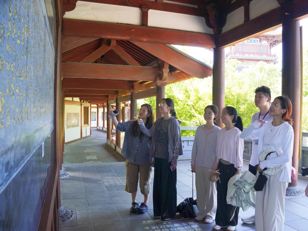 随后,实践队来到唐诗之路博物馆。馆内以多媒体技术生动再现了唐代诗人沿剡溪泛舟、访天姥寻仙的旅程。当潋滟湖面在投影中浮现,队员们登上了模拟小舟,现实与诗意交融,队员们仿佛回到千年前,与诗人们共游灵秀越地。馆内,一块电子展板尤引人注目,屏上动态呈现的“诗路地图”,清晰标注了诗人行迹与创作地点,队员们由此直观把握了唐诗之路的文化地理脉络。