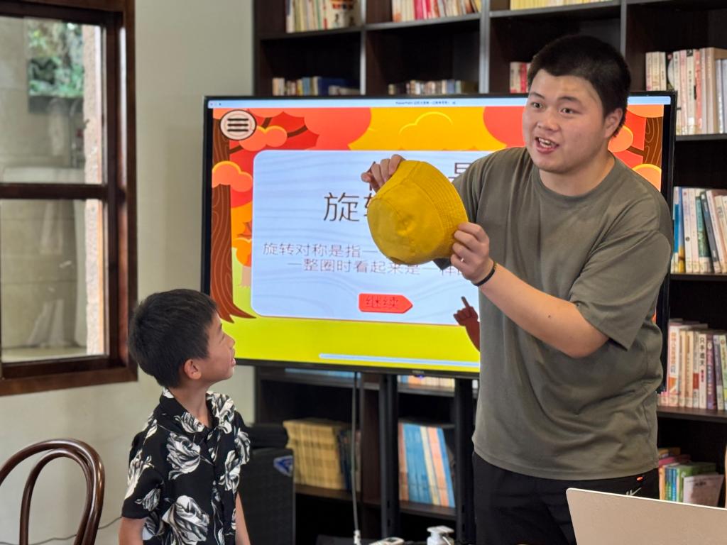 实践队通过组织多元化课程,采用寓教于乐的教学方法,向孩子们传递数学的奥妙与书法的艺术魅力。上午的课程从数学思维培养开启,队员们讲解图形对称性时,孩子们不仅掌握了轴对称、旋转对称等几何概念,还能在课后主动观察生活中的对称事物,拓展数学思维。