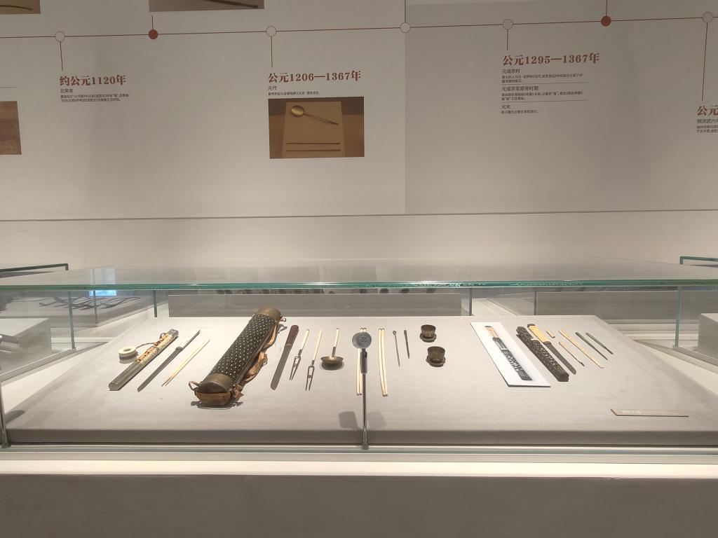接下来,实践队参观了二楼的历史文物展区。该展区珍藏着从商代的骨箸到清代的银筷,这些展品静静地诉说着时代的变迁与工艺的演进。同时,展区内的时间线更是清晰地展示出筷子从新石器时代到近现代的发展历程,让队员们对筷子的发展历史有了更直观的印象。例如,公元前6000年的新石器时代中晚期,河南禹州等地已使用骨箸、骨勺等餐具;公元前1320-1290年的商代中期,湖北阳新等遗址出土了精美的骨箸。这些展品不仅展示了筷子的演变,也反映了不同时期的社会风貌和工艺水平。