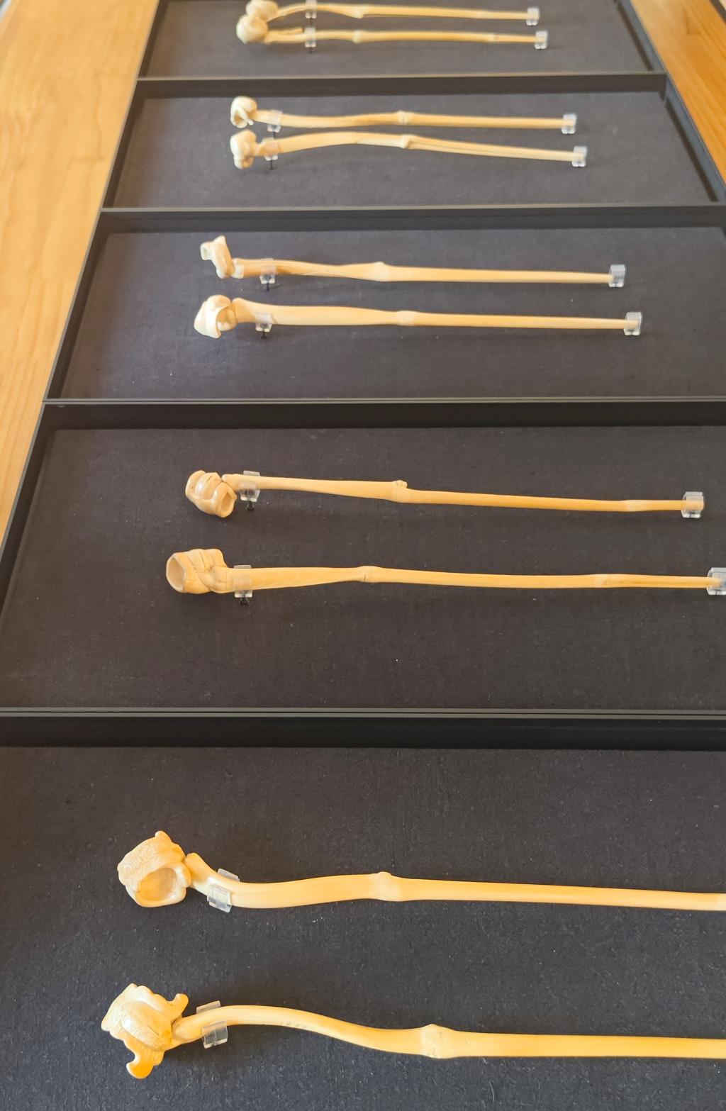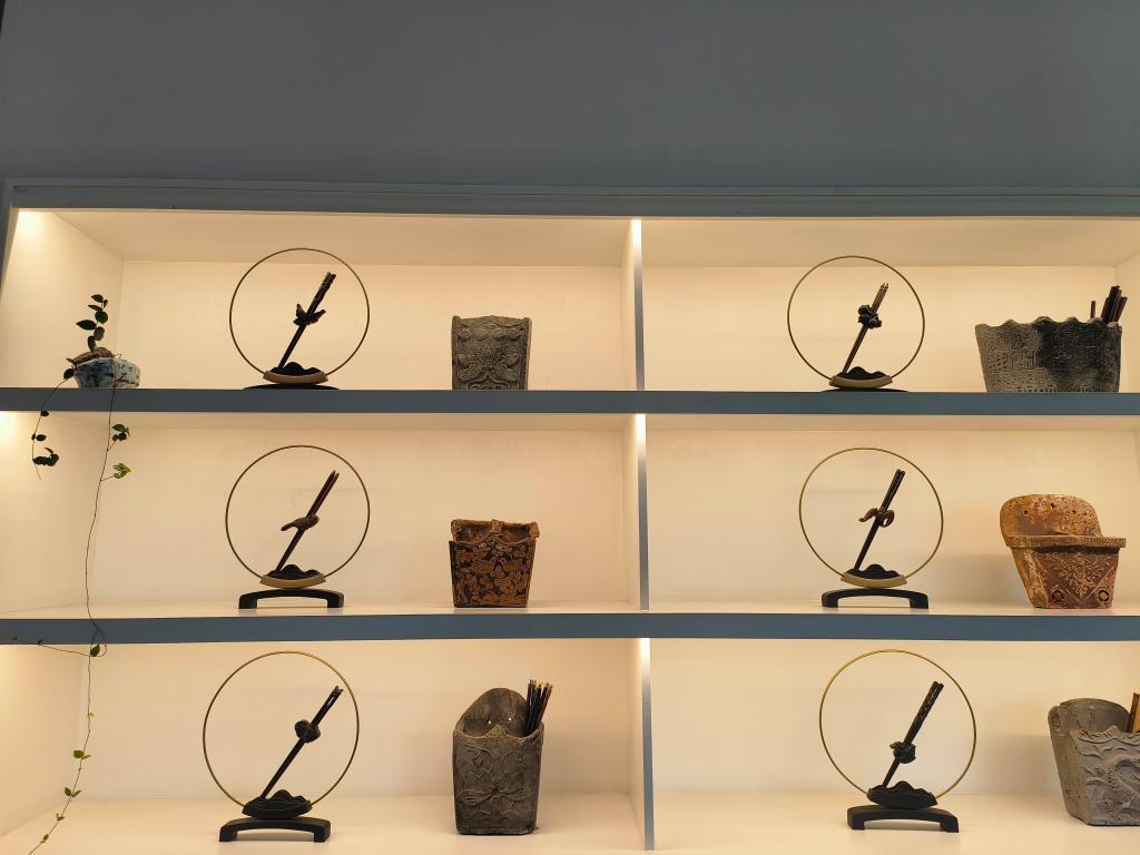 在博物馆一楼,展出了李馆长创作的大量筷子艺术品,其中“竹林十二钗”系列艺术筷尤为引人注目。李馆长介绍,这组作品是由他耗时六年多完成的满意之作。每一根筷子都是取用独特的枝节,根据大小、长短、粗细和枝节分布位置,寻找两根差不多的枝条,将它们雕刻打磨成不同年代的女子形象。这些筷子不仅展现了唐宋、明清等不同时期的女子风貌,还体现了李馆长对筷子文化的深刻理解和创新精神。每制作一根筷子都是对历史的一次回望,对文化的一次致敬。它们不仅是餐具,更是艺术品,承载着丰富的历史信息和文化内涵。