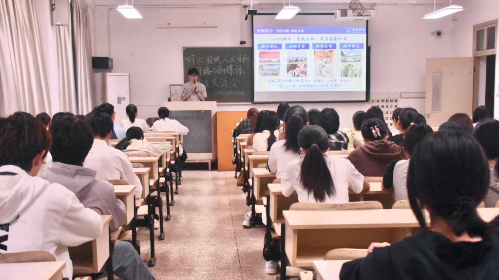 为助力2025级新生开启充实多彩的大学生活,提供实用有效的学业指导与未来规划,10月19日晚,人文学院于1210教室举办了2025级网络与新媒体专业新老生交流会。本次活动特邀辅导员鹿宵宵老师出席,22网新1班郑张博、23网新1班虞渺渺两位优秀学生代表担任分享嘉宾,2025级网络与新媒体专业全体新生共同参与。