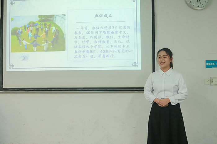会上,21个班级负责人从学风建设、班级风采和寝室生活等方面所开展的工作和取得的成效采用ppt形式进行班级学风建设汇报。以“家”为班级建设核心理念的17中文1班根据人才培养方案制定了自我发展、稳中求进的目标;17中教1班不拘一格,采用微电影的创新形式展开讲解;16中教4班则首创“读书笔记大赛”,通过多期的读书、赠书活动在潜移默化中提升同学们的人文素养;17历史共获得40余个荣誉称号,248项奖项;18中教2班的英语打卡和18思政1的班级常规数据统计都做的非常详细。