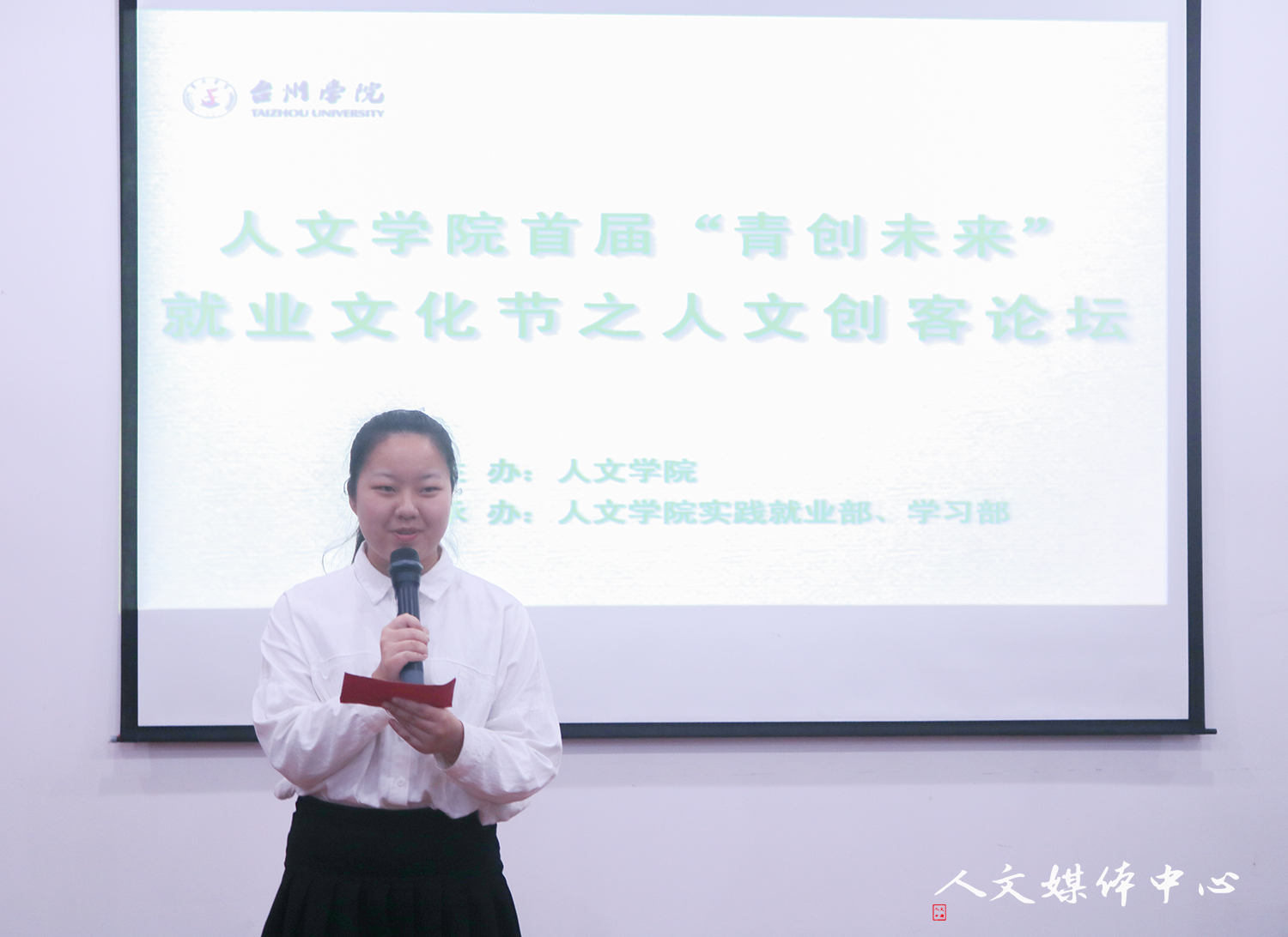 5月28日晚,人文学院“青创未来”首届就业文化节之人文创客论坛在临海校区学生活动中心202举行。浙江顶立添翼汽车部件有限公司总经理94届校友颜竞妃、上垟乡人大主席05届校友喻佳应邀与同学们分享职场经验。人文学院党总支书记郑丽君、副书记林霖出席,辅导员林仙、夏文杰和人文学院相关同学参加活动。
