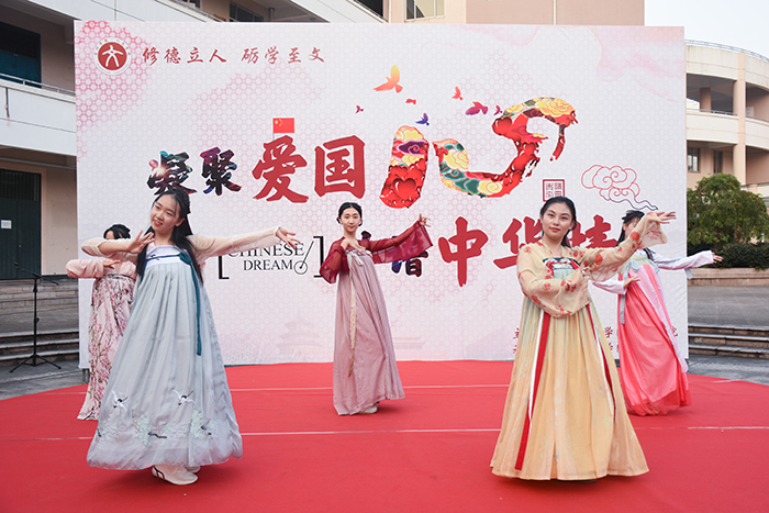 社团优秀节目展演环节中,文渊汉学社一舞《繁花》穿越古今,向大家展示浓浓中国古韵;“风雅”诵读社朗诵从古至今的多部爱国名家名篇,用声音诠释家国情怀。活动接近尾声,岑玥、李素芳、沈俏南、王启臻四位领唱同学用歌声吹响号角,在场师生挥舞手中的小红旗,集体合唱,感受着融入血脉中的中华情,《我和我的祖国》旋律回荡在学生活动中心上空。主题教育活动开始前,人文学子还齐聚八根大柱开展“快闪”活动,四支小分队挥动着小红旗缓步前行,汇合成方阵,齐唱《我和我的祖国》庆祝新中国成立70周年。