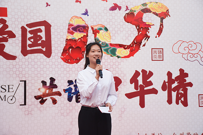 随后,人文学院苏畅老师以“新中国”三字作为演讲主题,首先针对中国的定义提出个人观点,其次分析“新”字蕴藏之意义,其极具感召力的语言和饱满的情感引发在场师生共鸣。吴若兰、林健峰两位同学动情的演讲将中国巨变展示于全体师生眼前。三位演讲者将信念的力量、大爱的胸怀、忘我的精神、进取的锐气等中华民族精神的写照以演讲的形式传之于众。