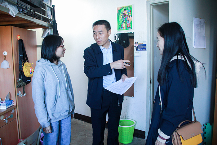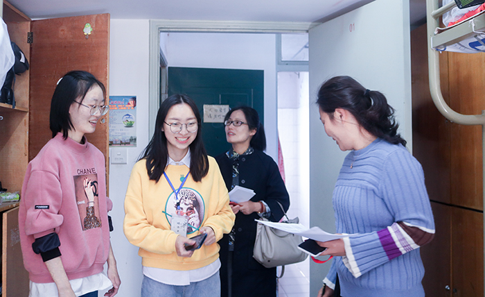 郑丽君书记肯定了同学们自发装饰公共楼道的行为。高平副院长在走访中表示,优良的寝室生活环境有助于学生保持良好的心态、更专注地学习。林霖副书记、辅导员夏文杰来到17号楼对男生寝室进行检查,对寝室卫生和物品摆放提出了建议。在走访过程中,老师们亲切地询问同学们的学习生活情况,提供相关建议与指导,氛围十分和洽。