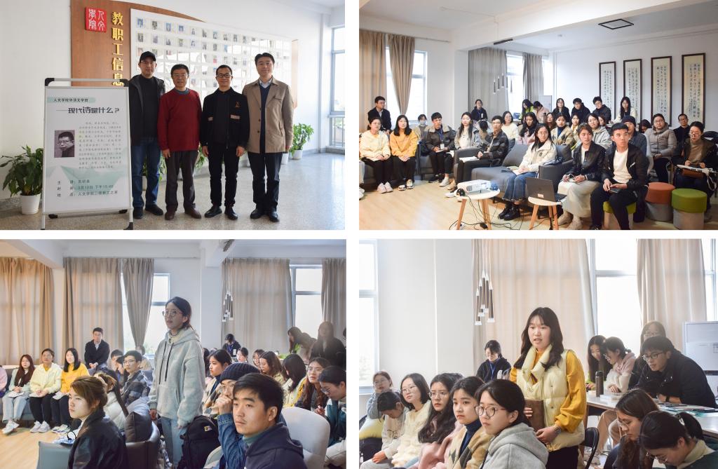 3月12日下午,鹿路文学社于学院教工之家开展了以“现代诗是什么”为主题的“华顶文学班”讲座。本次讲座由著名诗人、台州师专中文系校友苏明泉(伤水)老师主讲,诗人李达飞、柯登建以及陈诚(陈十八)出席,鹿路文学社部分成员以及相关文学爱好者参加讲座。