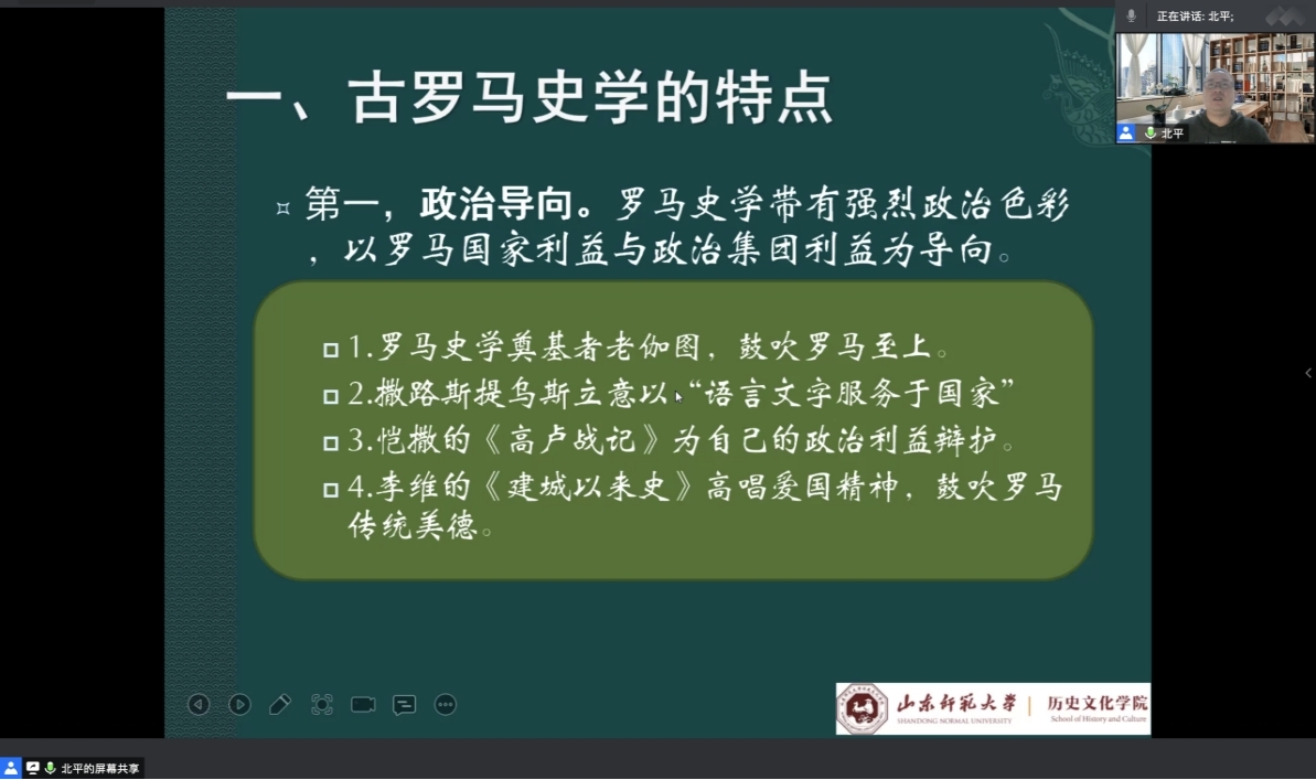讲座伊始,赵老师先从六个方面介绍了罗马史学的特点:一是政治导向,罗马史学带有强烈的政治色彩,以罗马国家利益和政治集团利益为导向;二是实用主义,重视历史经验,罗马史学兼收并蓄,广采博纳,并且是在本民族自我反思与希腊文化的影响下产生与发展的;三是继承了早期年代记的书写传统重视历史的连续性;四是既重视命运或者诸神对人事的影响,又重视人性的力量,特别是德性的力量;五是重视历史的真实性,亦既重视史事真假的判断,又强调史事的价值判断;六是重视史学的功用,罗马史家自觉地认识到史学真实性与实用性的统一。