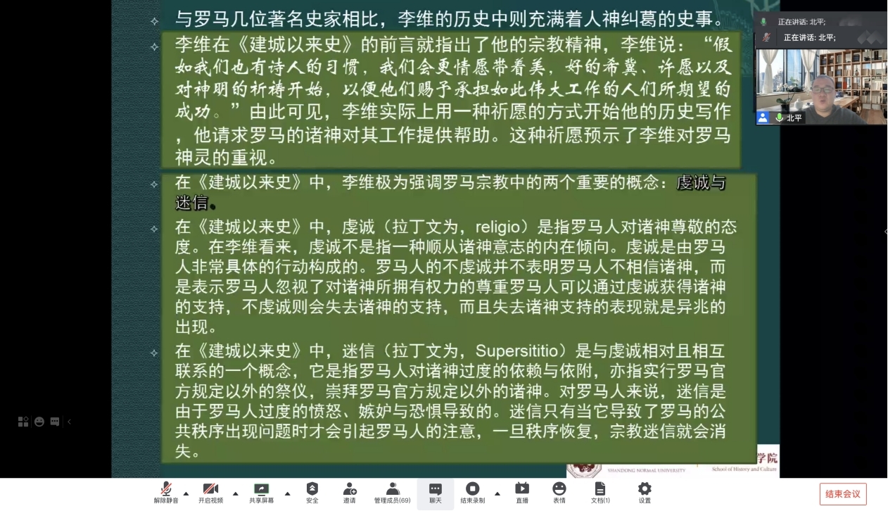 2021年4月13日晚,台州学院人文学院“三台史学”讲坛第3讲,在腾讯会议线上举行。由山东师范大学历史文化学院赵北平老师主讲,题为“罗马史学传统与李维史学思想”。讲座由人文学院程利伟老师主持,历史专业70余名师生参与此次讲座。