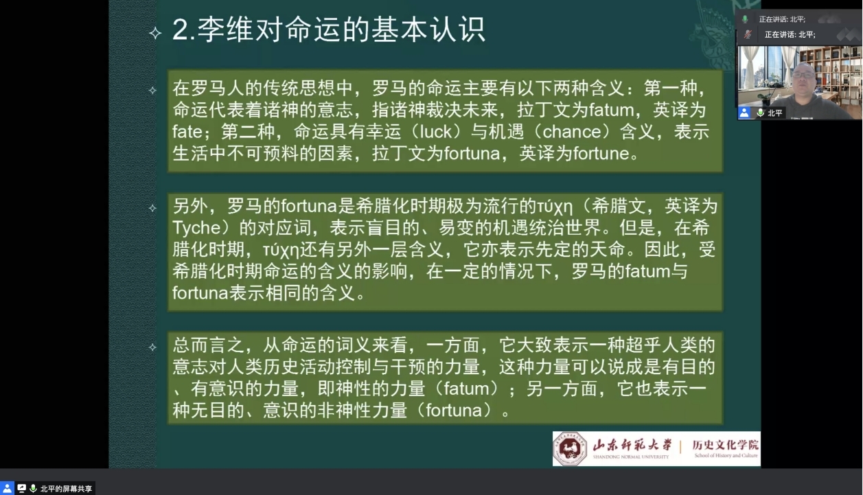 就李维的神人思想而言,赵老师解释到与罗马几位著名史家相比,在探究历史动因时,李维受斯多葛哲学影响将其分为三个层面:命运、诸神与人。李维用命运解释史事的原因仅出现于特定的情况中,用人的原因或诸神的原因无法对史事发生的原因作出解释时,他才会提及命运。在解释史事的原因时,李维往往用诸神与命运作为人的行为的背景,命运并没有规定历史事件发展的模式,人类的行为仍然起作用。据此,李维丰富了《建成以来史》中历史发展的动因,而不是仅用虔诚导致罗马人成功这样简单的模式来解释罗马的历史。