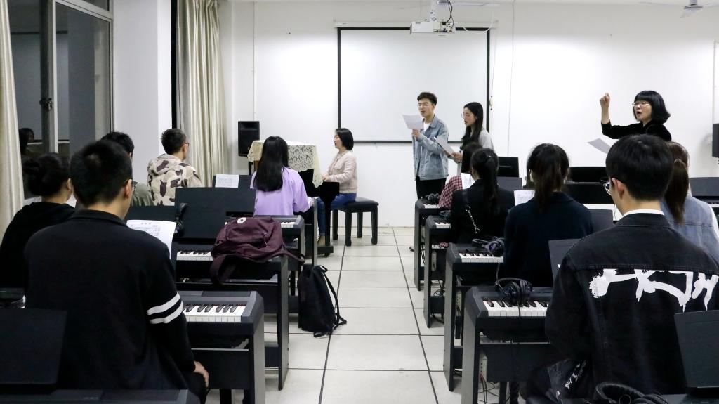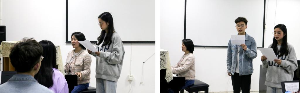 培训会在徐老师轻轻敲击的钢琴声中开始。随着老师的歌声响起,同学们也慢慢加入到《国际歌》的练习中来。徐老师告诉同学们,唱歌时一定要注意音准,要学会打开口腔,将声音“立”起来,让演唱更有层次感,更有表现力。因为对曲谱、歌词都不太熟悉,一开始同学们都不敢开口,徐老师反复示范,并用琴声带着大家慢慢掌握旋律节奏。同学们跟着老师的钢琴声进行了反复的练习,渐渐地找到了演唱的感觉。因为演出需要,还对两位主演进行了单独教学。随后培训场地也从8206转移到了人文学院4楼实训室,一边进行演出排练,一边继续《国际歌》的演唱教学。在《国际歌》激昂又深情的歌声中,同学们对剧情也有了更深刻的理解。