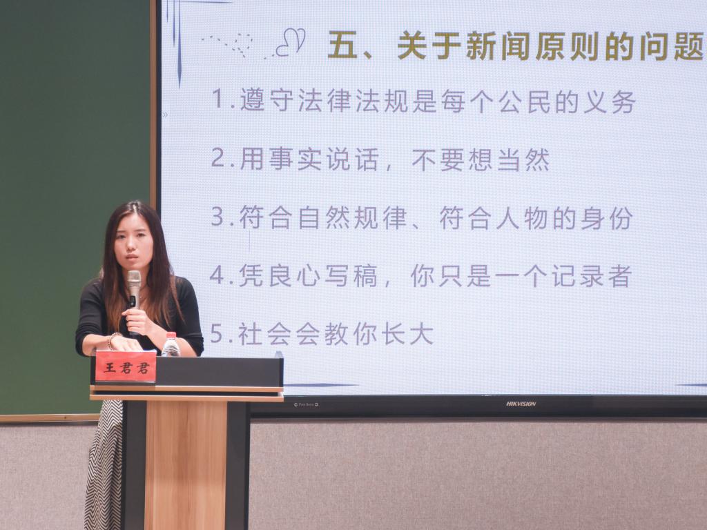 活动伊始,王君君带大家揭开了记者职业的神秘面纱,分享了在路桥报社多年的记者和编辑经验。她强调在自由采访前要充分了解采访对象,特别是跟随领导采访时要注重礼仪问题。她现身说法,以给消防队写稿时的经验为例,阐明了融入到采访对象中去的重要性。王君君还提出写作时必须时刻保持严谨的态度。随后她向同学们介绍了自己作为编辑部主任的工作,在修改他人语句文字时要兼顾文章整体,保留每个人的写作风格,她笑说自己的任务远没有旁人认为的那么轻松和风光。紧接着,王君君将平时积累的新闻稿技巧倾囊相授:写稿前要打好框架;撰写新闻稿时必须有条理地围绕新闻事实展开,用细节和故事让新闻稿的内容更加丰满;写完稿子之后务必再三检查,把自己当作第一读者,防止出现原则性错误。