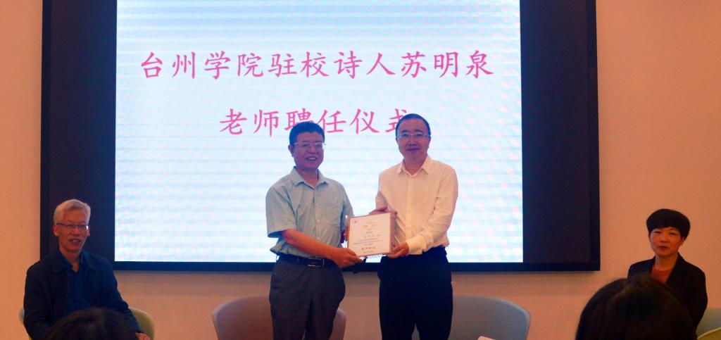 5月21日上午,台州学院驻校诗人聘任仪式在广文书院举行。校党委委员、副校长王正为苏明泉颁发聘书。学生工作部、人文学院和广文书院负责人,师生代表参加仪式。