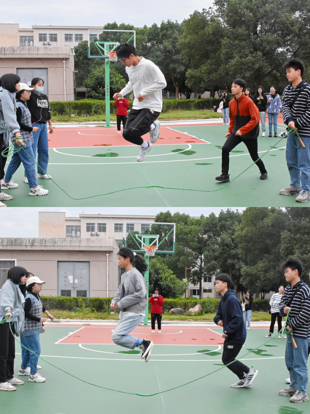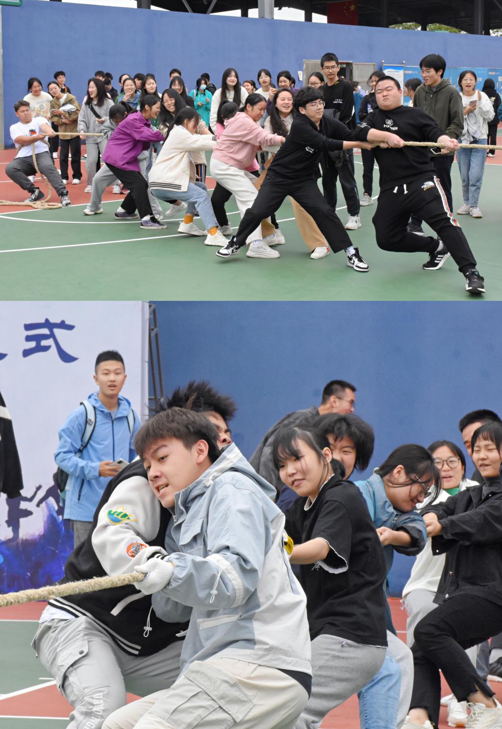 极富技巧性的“八字长绳”与比拼速度的“呼啦圈连连看”考验了大家的团结与协作,同学们从一开始的不得要领,经过内部讨论,在比赛中逐渐表现得游刃有余。“跑得快一点!” “球拍往前倾!”,“乒乓球接力赛”的同学们一起讨论战术,热切的心情感染了在场的所有人!最后,“拔河”终于在众人的期待中拉开序幕。双方队员抓紧绳子,降低重心,齐心协力向后拉。“3,2,1,拉——”两边队员齐声喊道,个个拼尽全力,脸涨得通红。虽然很累,但每个人的脸上溢满了快乐,汗珠在阳光下也在闪着光。