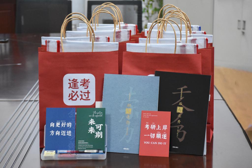 同时,学院为学子们准备了考研礼包,每一个礼包里的物品都由老师和同学们精心挑选,并由学院老师、学弟学妹们亲手为考研学子们写下祝福,使考研学子们感受到了来自学院的关怀和温暖。