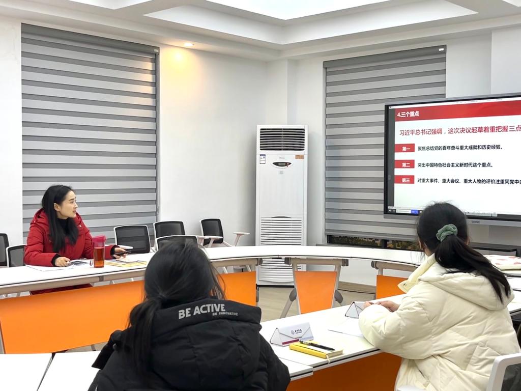 以实现中华民族的伟大复兴为己任,用青春奋斗践行强国誓言。林老师先从全会召开的背景、决议的主要内容和如何践行全会精神三个方面,给大家介绍了十九届六中全会。她表示,总结党的百年奋斗重大成就和历史经验,是顺应时代发展、党的自身建设的需要。她强调,青年大学生应勿忘昨天,从党的光辉历史中汲取奋斗力量,树立伟大理想,增强意气风发走向未来的勇气和力量;应无愧今天,要将美好青春绽放在祖国最需的地方;应不负明天,成为实现中华民族伟大复兴的栋梁。