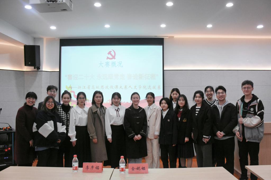 3月21日晚,“喜迎二十大,永远跟党走,奋进新征程”2022年浙江省高校思政微课大赛人文学院选拔赛在1号楼实训室顺利举行,共有11位选手参与本次选拔赛。人文学院金妮娅老师、李彦铭老师担任评委。
