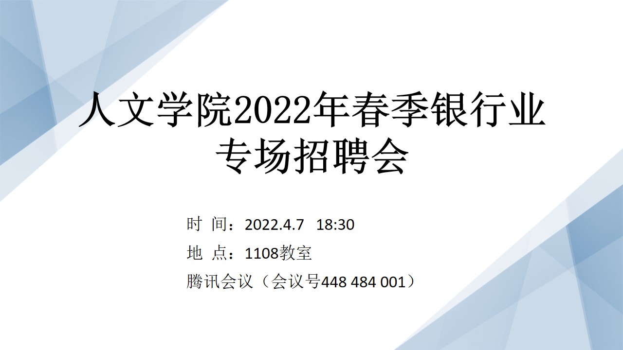 为促进毕业生充分就业,4月7日晚,人文学院在1108教室举办了2022年春季银行专场招聘会。招聘会采取“线上+线下”双线联合的方式开展,中国银行、宁波银行、泰隆银行、平安银行、民泰银行、交通银行、台州银行、中信银行、中国邮储银行等9家银行进行了宣讲。校学生处副处长马斌、人文学院党委副书记林仙、毕业班辅导员及部分2022届、2023届毕业生参加了招聘会。