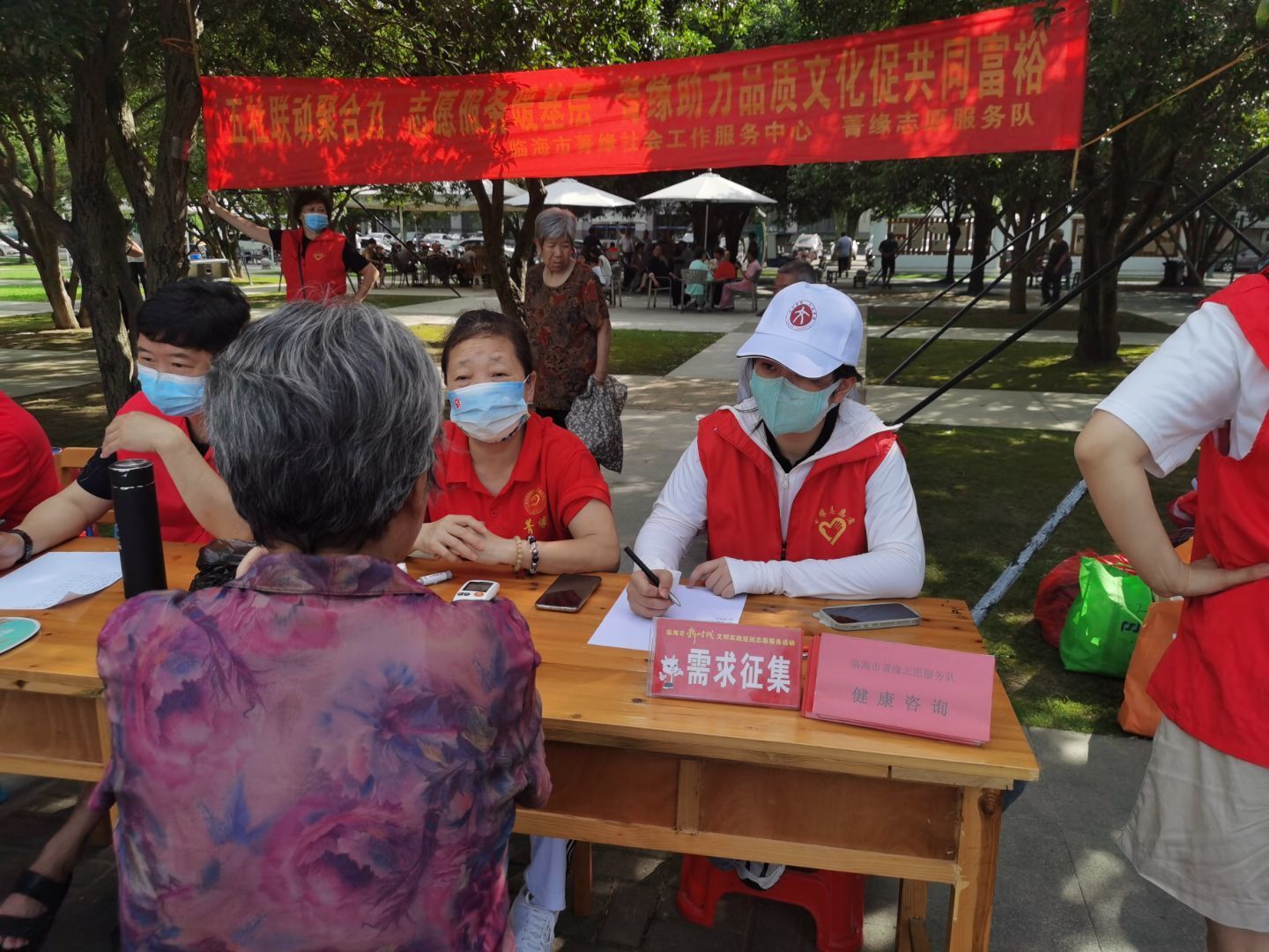 活动开始后,队员们以认真热情的态度向老人们解答活动内容以及报名的注意事项,为他们进行姓名、年龄等方面的登记。据了解,临海市菁缘志愿者服务队的成员来自各行各业,能够为保障老年人的健康生活提供优质、全面的服务。