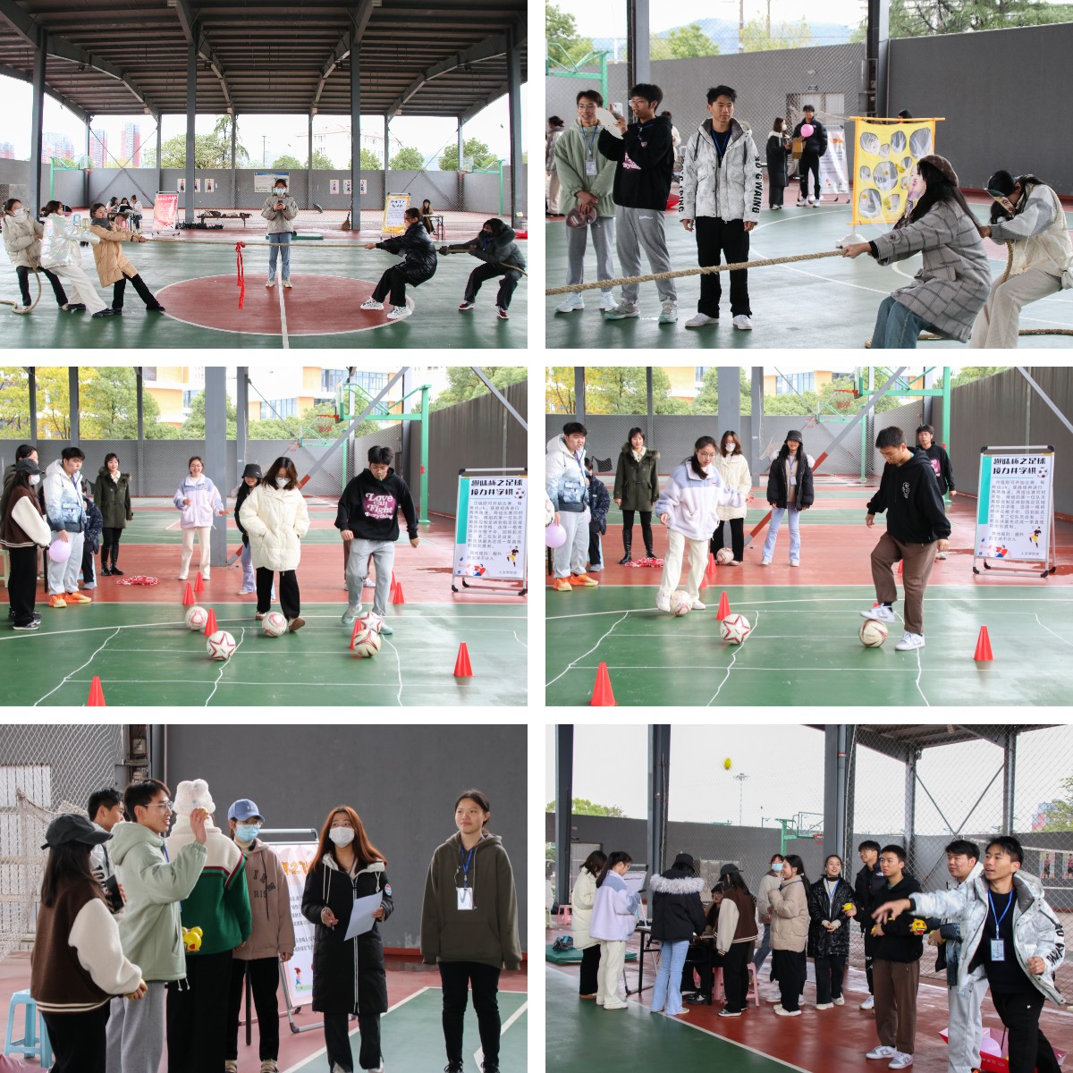 本次心理趣味运动会共设“足球接力井字棋”、“趣味杯之指压板”、“趣味杯之乒乓球”、“趣味杯之拔河赛”、“趣味杯之心心相印”、“趣味杯之飞沙袋”六个项目。同学们以寝室为单位参加比赛,在比拼中获胜的寝室可获得该项目的印章,比赛结束后,可用印章数量换取相应的抽奖次数。