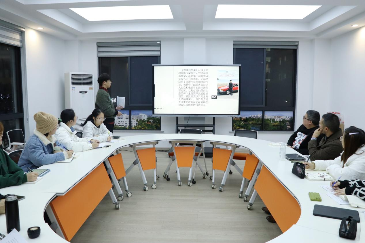 活动伊始,徐铭鸿同学对小说集中的部分情节、人物作出简单阐述,由此引入小说集改编的电影《驾驶我的车》。他指出,音乐与文字一样,是具有力量的,作为电影中必不可少的一部分,音乐在《驾驶我的车中》发挥着巨大的作用。随后,师生一起观看电影的配音导演石桥英子为电影配乐特地拍摄的片段,感受音乐中传达的情感。影片结束后,徐铭鸿同学对电影中的配乐与画面的协调配合提出了自己的想法。