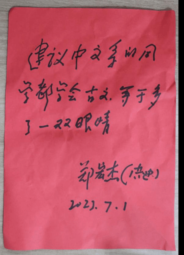 最后,郑宏杰老师与大家合影留念,并在纸上写下“建议中文系的同学都学会古文,等于多了一双眼睛”,表达了对同学们的美好期待。