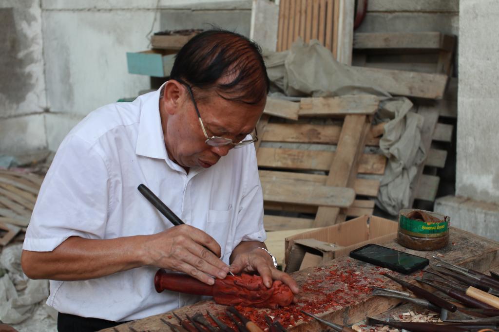 在庞灵芝老师的带领下,实践队来到美利特工艺品厂,开启探访木雕的旅程。本次拜访的木雕手艺人是谢小兴先生,队员们采访得知,谢先生已在木雕行业工作56年,至今仍以手工作为木雕制作的主要方式。交谈中,谢先生向队员们展示了木雕的详细流程。