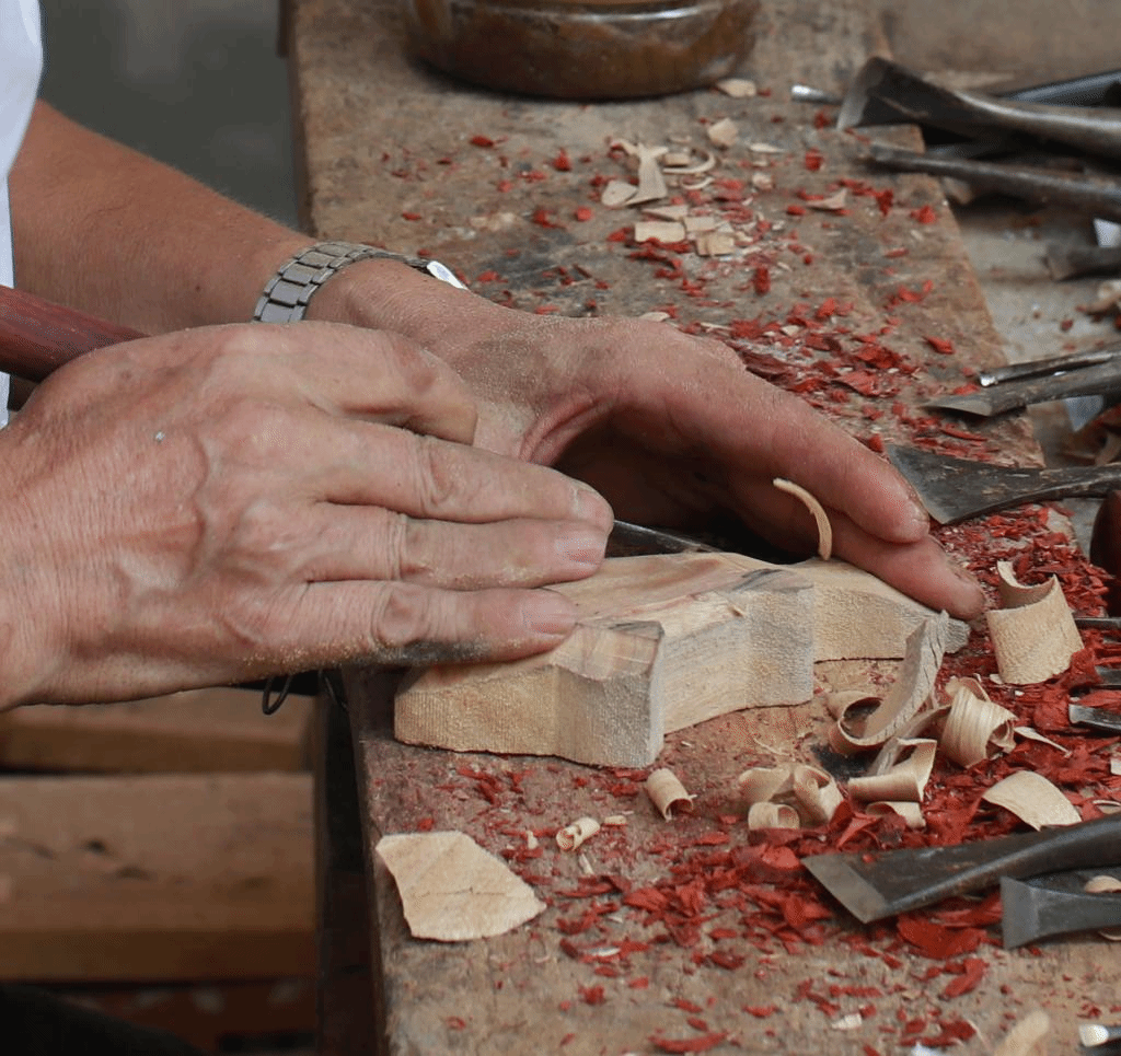 第二步,制作毛胚。这一个步骤需要在机器的辅助下削去多余大木块,用刻刀对剩余木料进行处理,削出物体大致形状。并且由于木料无法重复使用,在使用机器和刻刀时,要求手艺人对木料和工具都有精准的把控。