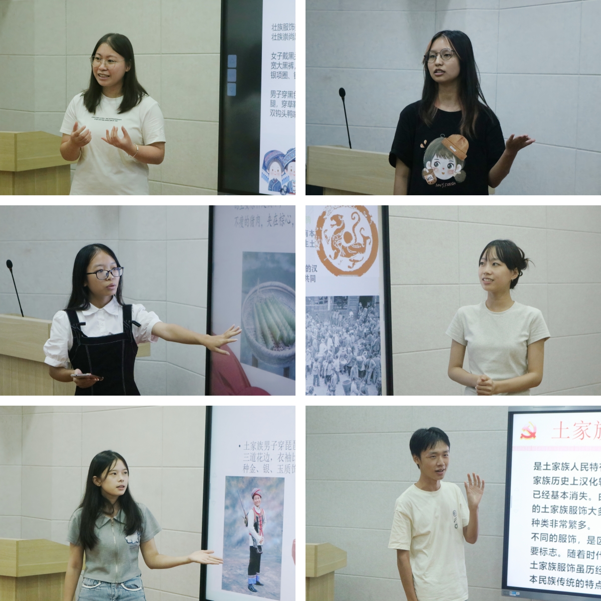在分享环节,来自拉萨的丹增措姆和扎西旺姆带大家云游西藏,介绍了藏历新年等节日与绕佛塔、献哈达等习俗。来自土家族的荆旭铖通过幽默风趣的语言,为大家展示了土家族的真实面貌;同为土家族的宋亚军、彭滕缘和郎诗雨较为系统地介绍了土家族的基本情况。随后,壮族同学黄慧玲、农艳珍、吴璇、陆建梅展示了壮族传统服饰、传统节日习俗以及壮族传统美食,向大家介绍了壮族传统中蕴藏的美好期许。彝族同学和晶分享了火把节传统,传达了彝族人民对火的自然崇拜。最后,畲族同学钟子硕生动介绍了红蓝服饰文化,吸引了全场目光。