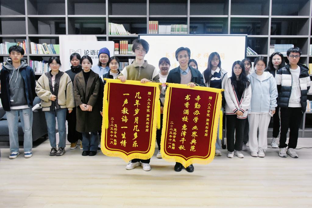 俯首育桃李,润物细无声。为祝贺郭建利老师光荣退休,11月23日,第123期“论语问茶”活动在一号楼二楼教工之家举行。人文学院院长李建军、院党委书记陈灵强、院党委副书记林军辉、优秀校友何贤桂、何媛、戴玲斐受邀出席本次活动,人文学院部分学生代表参与交流。