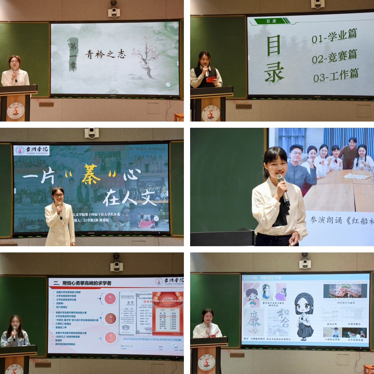 经班级推荐、个人自荐和学院审核,22名优秀学生进入现场评选。各候选人依次通过PPT展示、视频短片等形式,全面展示个人风采。他们中有奔走于赛场,斩获各类大小奖项的竞赛达人;有脚踏实地,实践公益的志愿服务领航者;有投身乡村,致力于乡村非遗文化保护的先行者……候选人们坚守信念,勤奋刻苦,厚积薄发,生动诠释了自己在学习、科研、竞赛、创新创业、社会实践、志愿服务等方面的收获与成长,他们丰富的经历和优秀的表现,赢得现场师生阵阵热烈掌声。