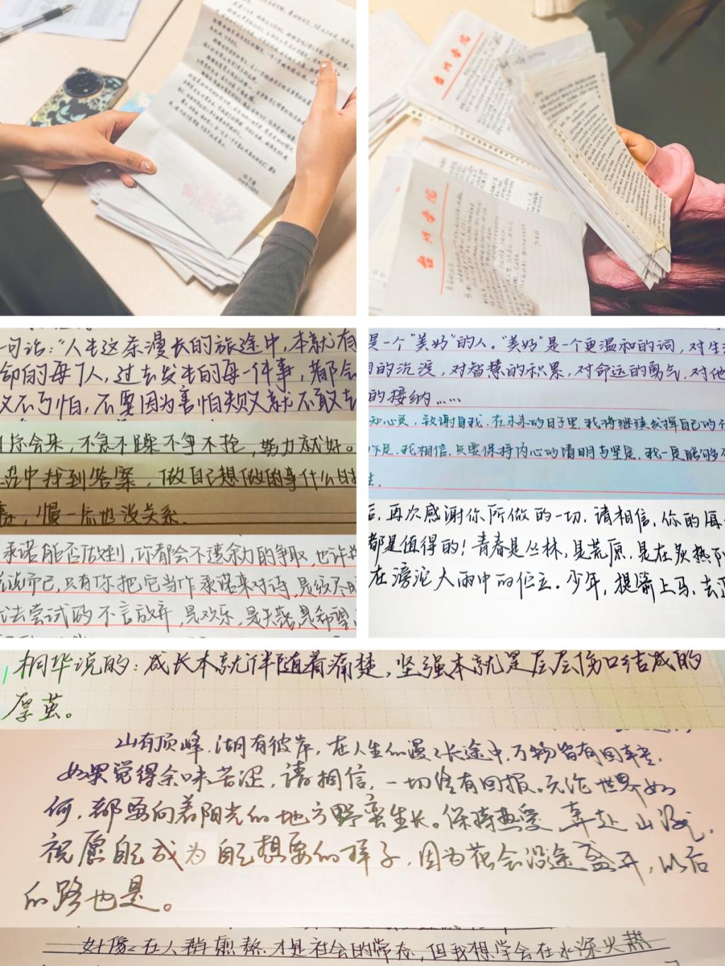 “山有顶峰,湖有彼岸,在人生的漫漫长途中,万物皆有回转。如果觉得余味苦涩,请相信,一切终有回报。无论世界如何,都要向着阳光的地方野蛮生长。保持热爱,奔赴山海。祝愿自己成为自己想要的样子,因为花会沿途盛开,以后的路也是。”某位同学在信中如是说道,希望活动中的这些话不仅可以激励同学自己的内心,也可以鼓舞看到这些话的所有同学。