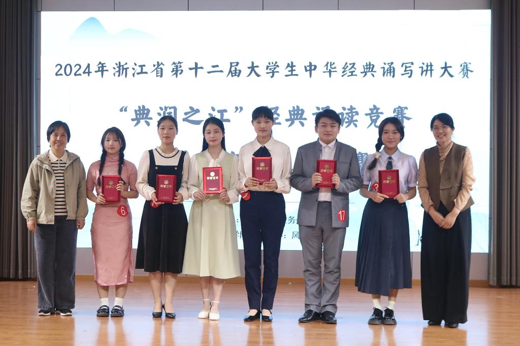 赛毕,评委老师阮佳佳做出点评,细致分析了选手们出色的表现。金妮娅表达了对现场支持者的感谢,以及对选手的鼓励。经过评比选拔,陈子莹、林思齐获一等奖;班后璇、黄源源、龙悦、李木陶子获二等奖;杨思洁、杨钰涵、刘云鹏、黄泺璋、汪琦、江帆获三等奖。据悉,本次校级选拔赛的前八名选手将获得参加浙江省第十二届大学生中华经典诵读竞赛初赛资格。