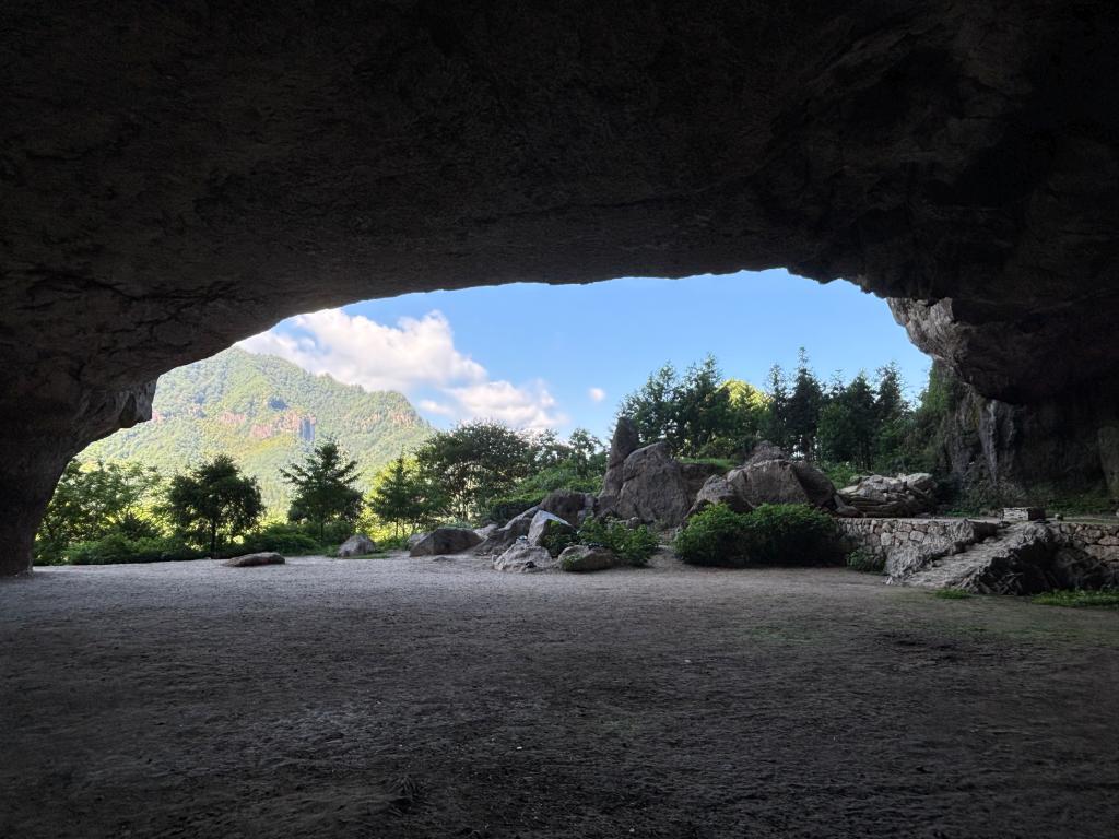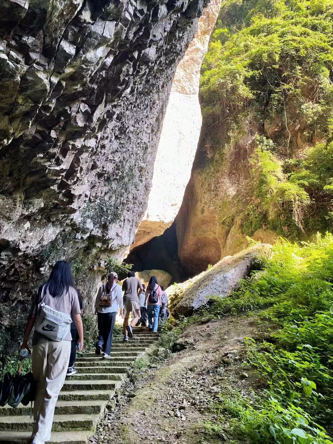 寒岩,这座因唐代诗僧寒山子命名的圣地,被誉为天台之巅的璀璨明珠——“天台第一大洞”。踏入其幽深的洞口,两侧奇岩峭壁巍然耸立,引领着实践队员步入一个超凡脱俗的世界。洞内,巨嶂如天幕低垂,飞岩欲坠未坠,展现出一幅动人心魄的壮丽画卷,恰如寒山诗所云:“一住寒山万事休,更无杂念挂心头”,暑热与尘嚣,至此皆消。郝老师深情讲述,寒山子曾于此间宴坐悟道,以石为伴,以风为友,留下了一串串启迪心灵的诗篇,传唱千古。随后,实践队员们也在这片充满灵性的土地上,齐声朗诵寒山子的十首佳作,每一句都蕴含着和合之道,让人在音韵流转间,深刻体会到人与自然、心灵与宇宙间那份和谐共生的美妙意境。