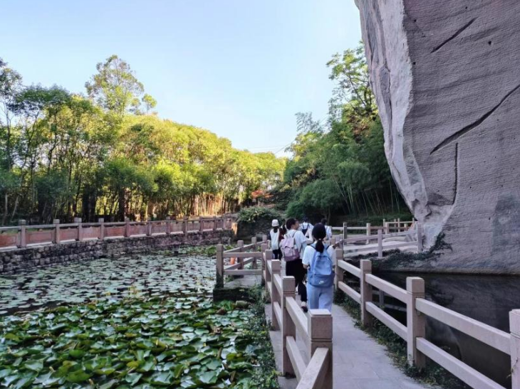 7月6日下午,实践队行至天台山大瀑布,随后前往天台国清寺。国清寺为中国佛教天台宗的发源地,亦为日韩两国佛教天台宗的祖庭。实践队立足于宗教文化、和合文化、诗词书法艺术,先后游览碑廊、隋梅、隋塔等景点,聚焦于挖掘、展示国清寺的诗词底蕴,以此更好契合作为实践队调研主题之一的“诗韵山水旅”。