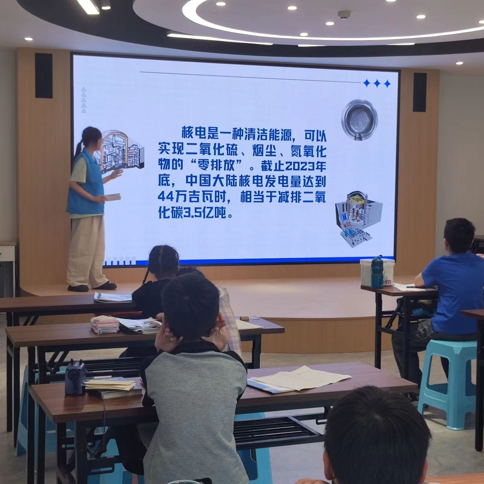 “火力发电厂、水力发电厂、风力发电厂……这些发电厂虽然各有千秋,但也存在不容忽视的环境问题。”宣讲团成员通过生动的案例和直观的展示,向小朋友们揭示了传统发电方式对环境的影响,进而引出核能发电的独特优势。