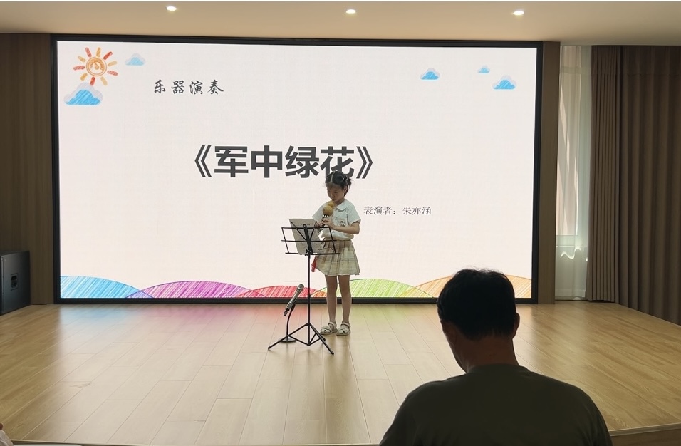 接下来的节目是朱亦涵小朋友带来的葫芦丝演奏《军中绿花》和冯锦涵、陈芷羽小朋友的舞蹈《勇气大爆发》。现场的气氛欢乐且活跃,器乐声、舞蹈配乐声、掌声此起彼伏,童真的氛围渲染着在场的每一个人。