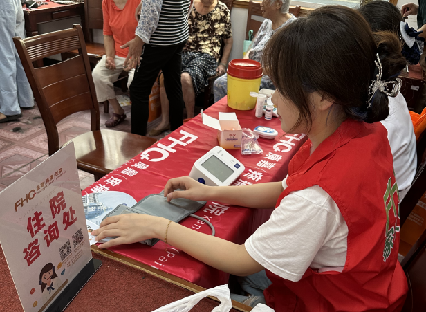 实践队成员庞佳怡为居民测量血压