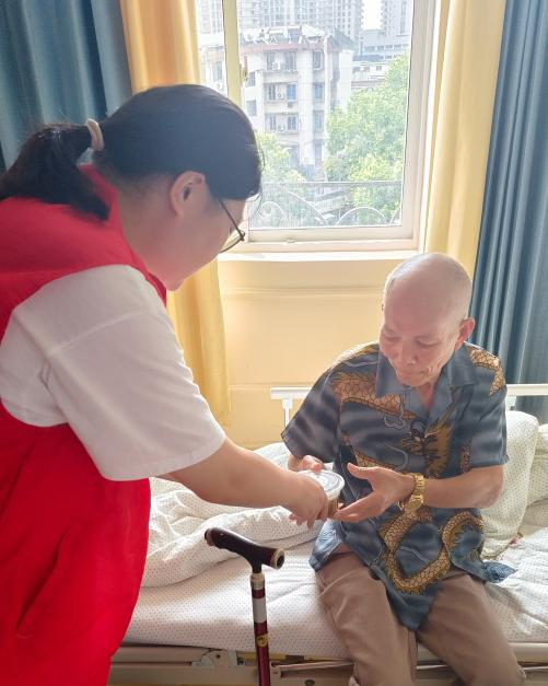 晨光初破晓,由文心润诊实践队精心组织的病房慰问行动拉开序幕。实践队成员们手持精心熬制的绿豆汤,逐一走进康嘉医院的病房,将这份满载着清凉与关爱的饮品亲手递到住院患者及其家属的手中。