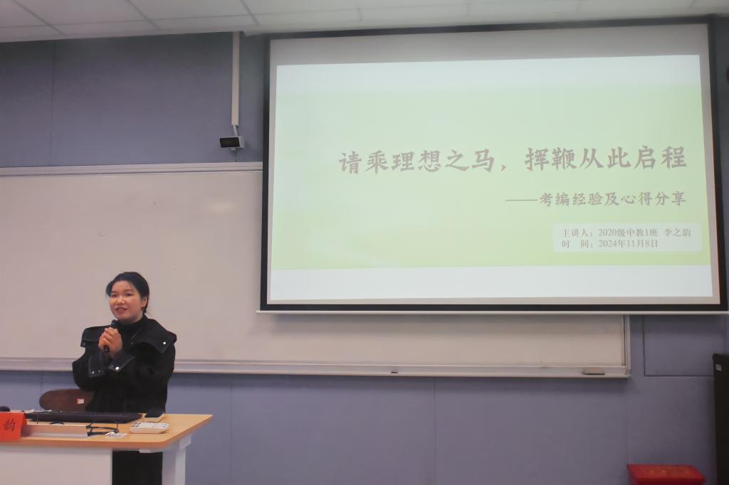 李之韵,现任教于台州市白云中学,曾在椒江区教育局赴华师大招聘考试中取得初中组语文第二名的优异成绩。活动伊始,李之韵引用了流沙河的《理想》作为开篇,叙述自己在大学期间以提高自身语言表达能力为目标,不懈努力,最终成就自我的奋斗历程。她总结出“找到一条适合自己的路,坚定地走下去”和“认识自己,悦纳自己,包容自己”两条心得感悟,并以此寄予她对同学们的殷切希望,使同学们深受鼓舞。
