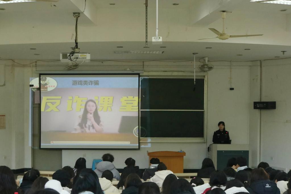 讲座伊始,徐扬益介绍了2024年临海市发案情况,警示同学们诈骗现象无处不在。此外,她指出当前被骗人员年龄日趋低龄化,加之诈骗手段日渐新颖化,使得当下学生的受骗风险增加。通过现场互动调查,徐扬益还与同学们一起讨论了身边遇到诈骗电话的实例。她结合同学们遇到的真实案例及相关防诈视频,对冒充公检法、冒充客服、游戏诈骗、虚假购物等多种不同类型的诈骗进行了详细讲解。徐扬益强调,希望同学们可以从今天分享的案例中吸取经验,提高个人警惕意识,有效辨别来电信息的真假,切勿轻信陌生人信息,抵制诱惑,避免落入诈骗陷阱。