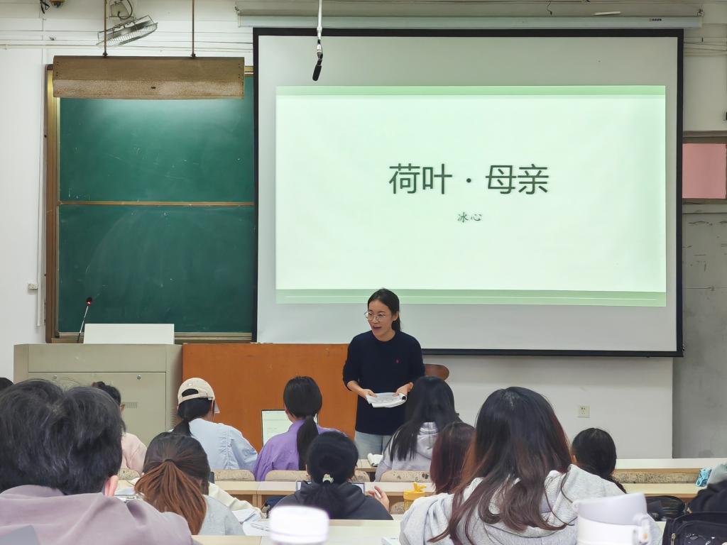 模拟授课结束后,杨祖艳老师对两位同学的课堂进行专业点评。她首先肯定了两位同学在语言表达、板书设计及整体教学设计上的亮点;随后重点强调,教学中需重视处理学生随机回答,确保问题设置兼具开放性与可答性,做到让学生有话可说;同时针对文本特点提出建议,如《荷叶·母亲》应突出情感、《金色花》需聚焦事件讲述,可通过分组朗读深化文本特色;此外,还明确区分象征与托物言志的概念差异,并指出教学设计需注重问题环环相扣,帮助师生理清课堂思路,为师范生后续教学能力提升提供关键指导。