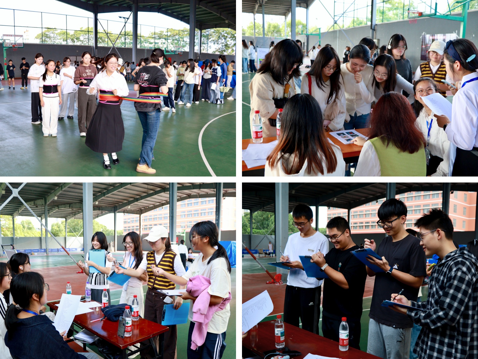开幕式后,“朵拉的探险之旅”趣味游园活动正式拉开帷幕。活动以寝室为单位参与,共设六大特色关卡:“丛林冒险(绕腰拉绳)”考验团队动作协调,成员们节奏一致、互相鼓励;“攀登高山(脑筋急转弯)”比拼思维敏捷,室友们围坐讨论、争相作答;“潜入深海(雷区取水)”强调精准配合,队员们谨慎规划、传递水杯;“迷离双眼(心口不一)”频现趣味反转,失误之处引来阵阵欢笑;“沙漠咒语(谐音猜谜)”激发奇思妙想,趣味谜题点燃全场热情;“心有灵犀”环节则充分展现了室友之间的默契与信任。这些看似轻松的游戏,处处蕴含着集体意识与合作精神。活动现场,各寝室成员齐心协力、共闯关卡。大一新生在合作中迅速拉近距离,高年级同学也积极参与,与学弟学妹热情交流。欢呼声与讨论声此起彼伏,大家在攻克难关时共商对策,在顺利通关时共享喜悦,轻松愉快的氛围中增进了彼此的了解和情谊。