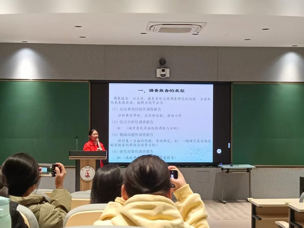 11月18日上午,金凤老师聚焦 “调查报告的写作”开展专题讲座。在讲座中,金凤老师结合案例为我们详细讲解了调查报告的类型,在调查报告写作中需要注意的问题及写作重点。调查报告中的问卷问题需要避免一些对调查内容无用的问题,强调问卷设计的针对性与逻辑性,为同学们后续开展市场调查、撰写报告提供了实用指导。