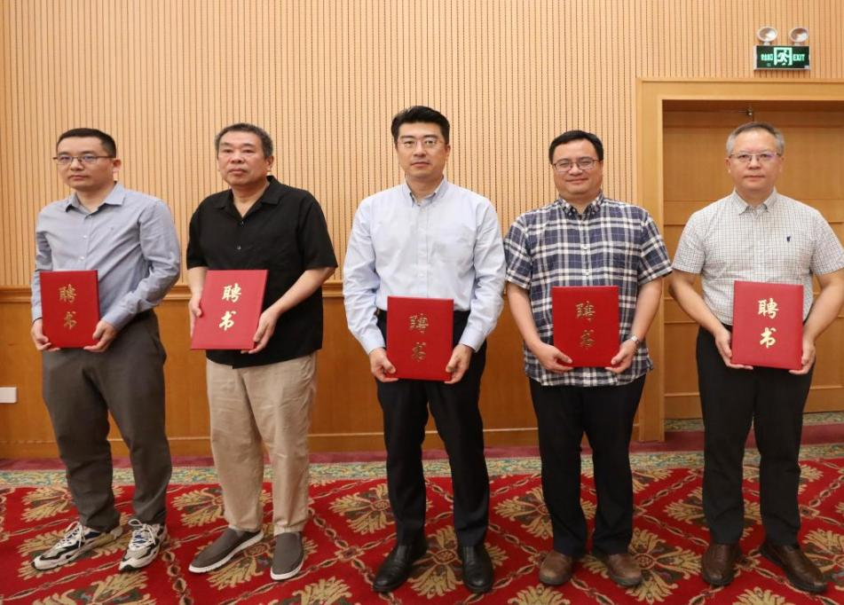 图为院长罗争鸣教授和张京华教授、张呈忠教授等成员接受聘书